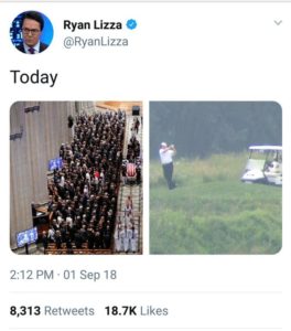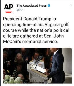 Now, it’s completely logical to note the fact that Trump was conspicuously not invited to McCain’s funeral*. So what else is a golf-loving man going to do on a beautiful Saturday but golf?  It’s perfectly reasonable that he should hit the links while everyone else lies about what a great guy McCain was.