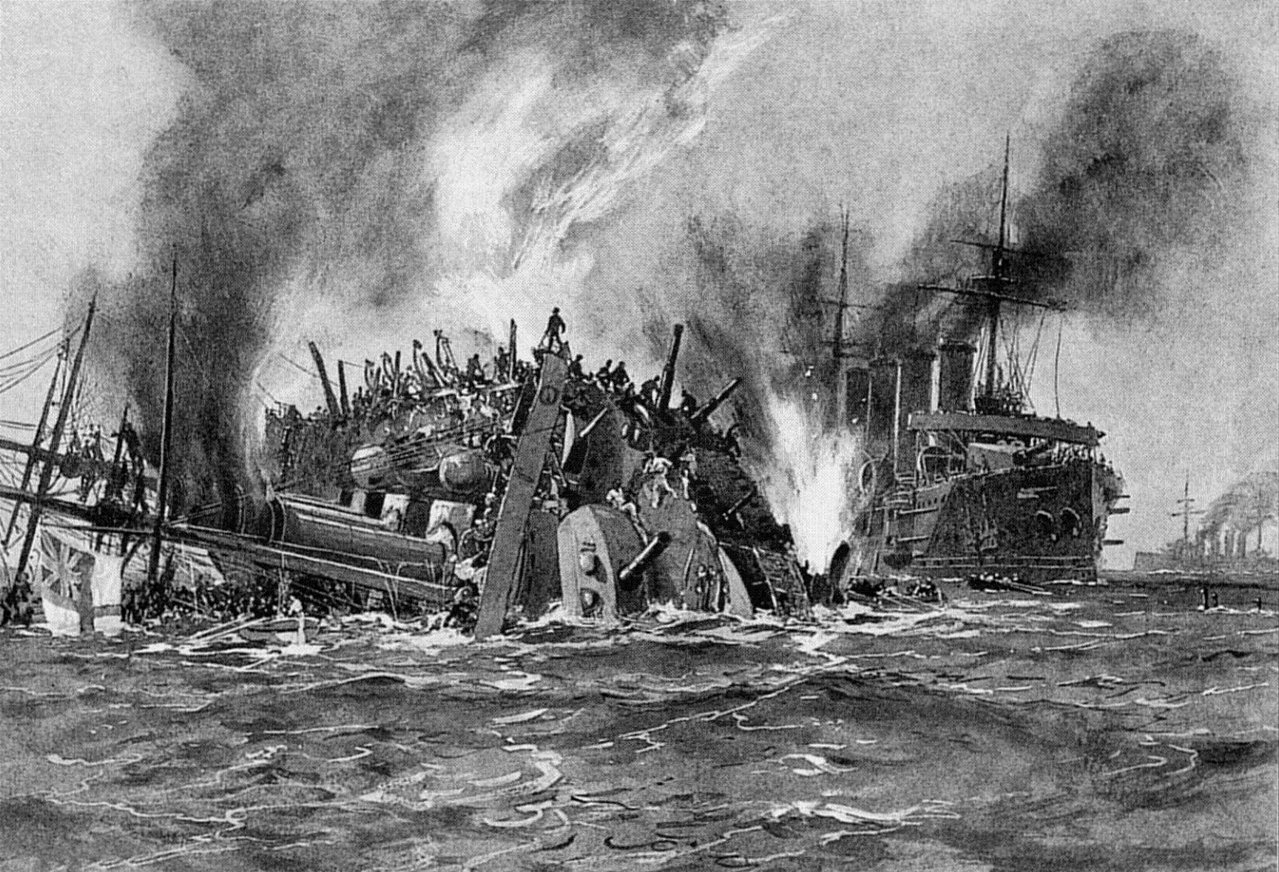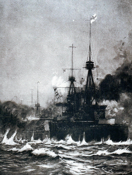 It was now noon. From behind the veil of the surrounding mist came the Falmouth and Nottingham, which with the guns in their turrets completely finished the hapless Mainz, and their sailors openly admired the bravery of her crew, which, while she sank, maintained perfect order and sang the German national air.