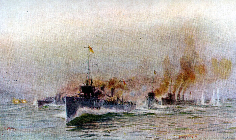 The Germans had taken heed of the value of mines from lessons learned at the cost of Russia in the war with Japan, and set about distributing these engines of destruction throughout the North Sea. The British admiralty knowing this, sent out a fleet of destroyers to scour home waters in search of German mine layers.