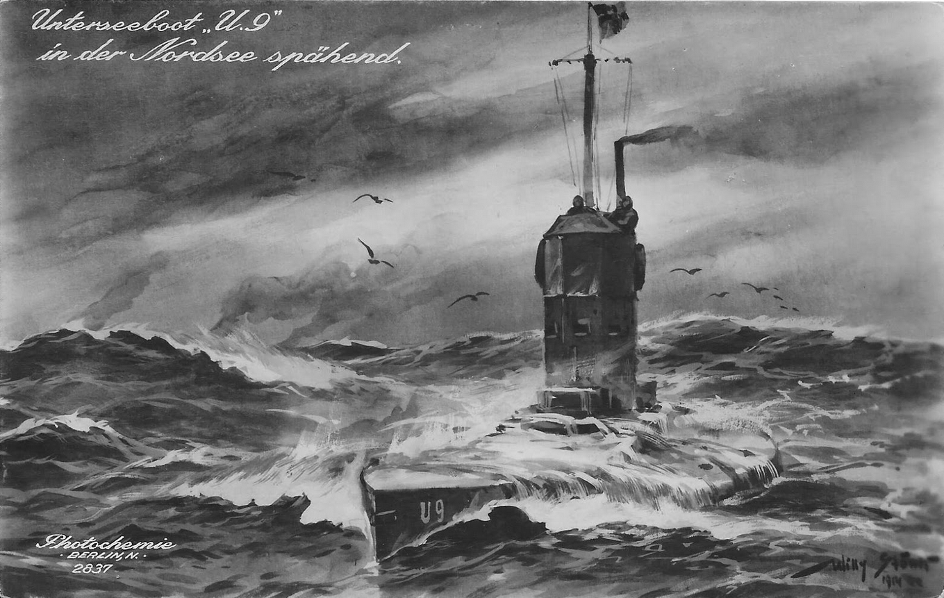 On September 22 the three slow British cruisers Cressy, Hogue, and Aboukir were patrolling the waters off the Dutch coast, unaccompanied by small craft of any kind, when suddenly, at half past six in the morning, the Aboukir crumpled and sank, the victim of another submarine attack. But the commander of the Hogue thought she had been sunk by hitting a mine, and innocently approached the spot of the disaster to rescue such of the crew of the Aboukir as were afloat. The work of mercy was never completed, for the Hogue itself was hit by two torpedoes in the next few moments, and she joined her sister ship. The commander of the Cressy, failing to take a lesson from what he had witnessed, now approached, and his ship was also hit by two torpedoes, making the third victim of the German policy of attrition within an hour, and Captain Lieutenant von Weddigen, commander of the U-9, which had done this work, immediately became a German hero.