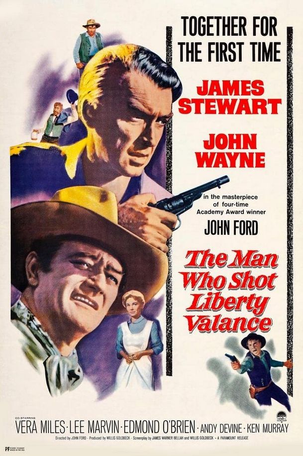 It’s a John Wayne movie. It’s a Jimmy Stewart movie. The thing that holds the two types together is Lee Marvin’s ruffian character. Both leading men are almost too old for their parts but the black and white covers that. Despite being cheaply made — compare with other movies in the genre or early 1960s — it’s done well.