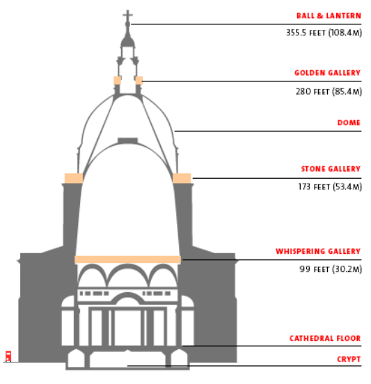 The magnificent Dome is composed of an outward and inward shell, and between these there rises a cone-shaped structure which supports the lantern, crowned with its golden ball and cross. The arrangement of this is most complex, and is a witness to the marvellous skill of the architect. Above the row of Composite columns is a gallery, which affords a good view to those who are anxious to climb. Above the actual dome is the Golden Gallery, and then the lantern, roofed with a dome bearing the ball and cross. The whole height is 365 feet.