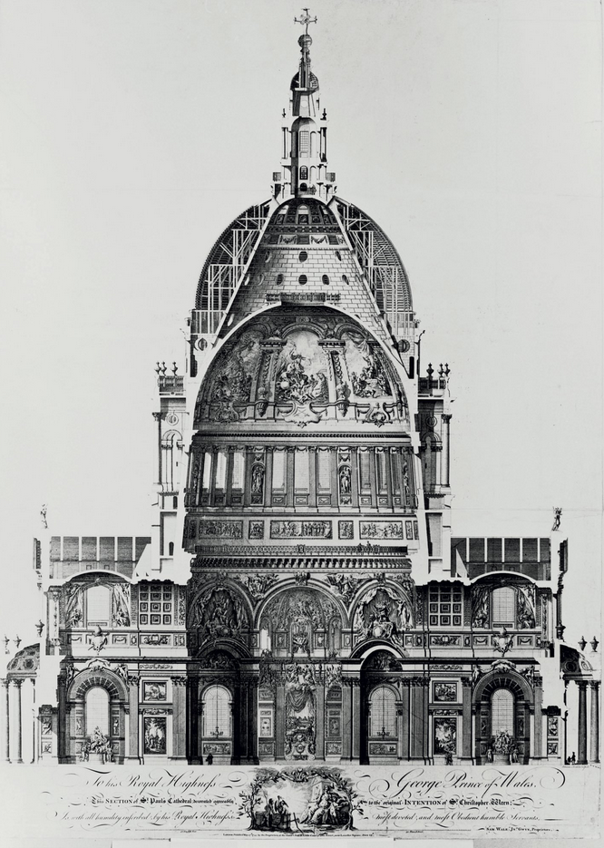 Evelyn, in his diary, describes his visit to the church before the fire with Dr. Wren, the bishop, dean and several expert workmen. “We went about to survey the general decay of that ancient and venerable church, and to set down in writing the particulars of what was fit to be done. Finding the main building to recede outwards, it was the opinion of Mr. Chickley and Mr. Prat that it had been so built ab origine for an effect in perspective, in regard of the height; but I was, with Dr. Wren, quite of another judgment, and so we entered it: we plumbed the uprights in several places. When we came to the steeple, it was deliberated whether it were not well enough to repair it only on its old foundation, with reservation to the four pillars; … we persisted that it required a new foundation not only in regard of the necessity, but that the shape of what stood was very mean, and we had a mind to build it with a noble cupola, a form of church-building not as yet known in England, but of wonderful grace….”