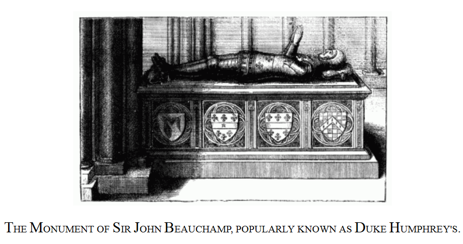 Duke Humphrey’s tomb was the great meeting-place of all beggars and low rascals, and they euphemistically called their gathering “a dining with Duke Humphrey.”