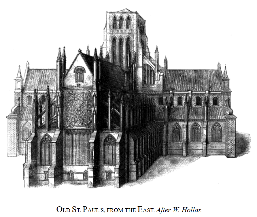 Both the diarists, Pepys and Evelyn, speak of the melancholy spectacle of the great ruin. Pepys laments over the “miserable sight of Paul’s church, with all the roof falling, and the body of the nave fallen into St. Faith.”