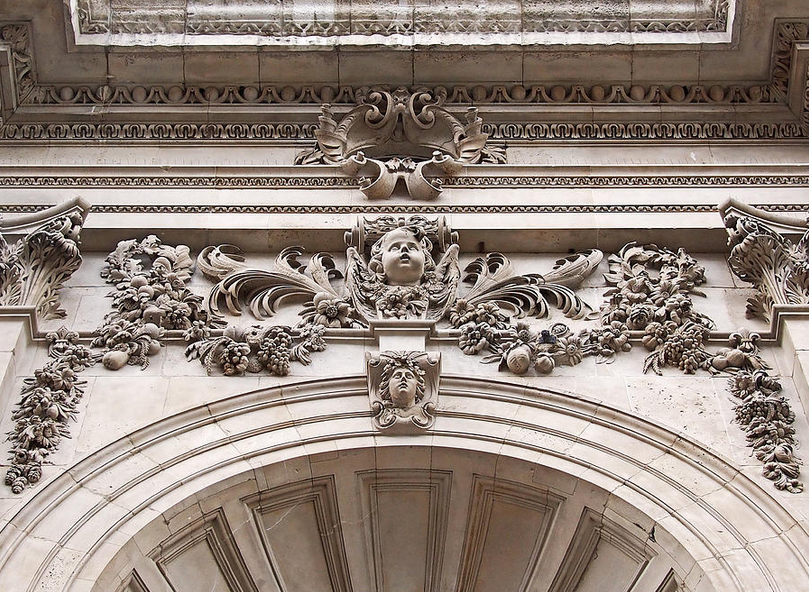 Proceeding to the north side we note the two-storied construction, the graceful Corinthian pilasters, arranged in pairs, with round-headed windows between them; the entablature; and then, in the second storey, another row of beautiful pilasters of the Composite order. Between these are niches where one would have expected windows; but this storey is simply a screen to hide the flying buttresses supporting the clerestory, as Wren thought them a disfigurement. The walls are finished with a cornice, which Wren was compelled by hostile critics to add, much against his own judgment. There are some excellently-carved festoons of foliage and birds and cherubs, which are well worthy of close observation. The North and South Fronts have Corinthian pillars, which support a semi-circular entablature. Figures of the Apostles adorn the triangular-shaped head and balustrade. The Royal arms appear on the north side, and a Phœnix is the suitable ornament on the south, signifying the resurrection of the building from its ashes.