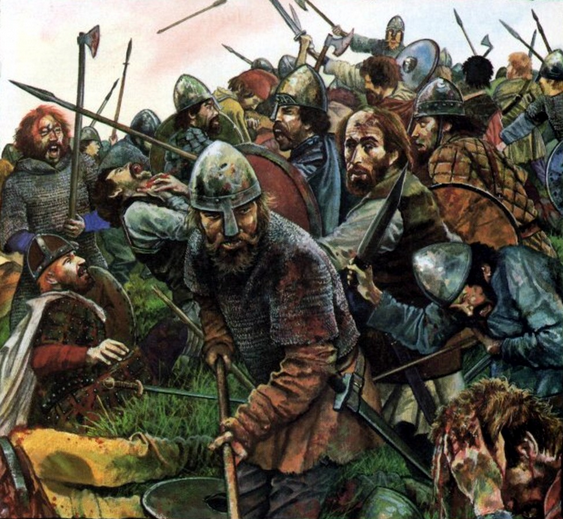 The army then advanced to the attack, the Danes having been drawn out hastily, but with as much order as the suddenness of the call would allow to meet them. When near enough for their arrows to take effect, the long line of Alfred’s troops discharged their arrows. They then advanced to the attack with lances; but soon these and all other weapons which kept the combatants at a distance were thrown aside, and it became a terrible conflict with swords, man to man.