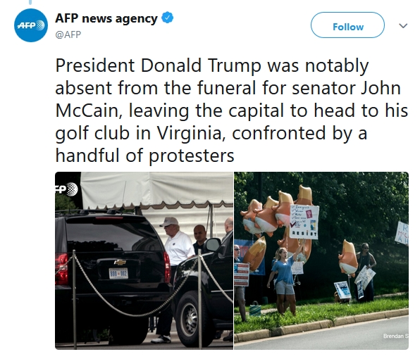 Now, it’s completely logical to note the fact that Trump was conspicuously not invited to McCain’s funeral*. So what else is a golf-loving man going to do on a beautiful Saturday but golf?  It’s perfectly reasonable that he should hit the links while everyone else lies about what a great guy McCain was.