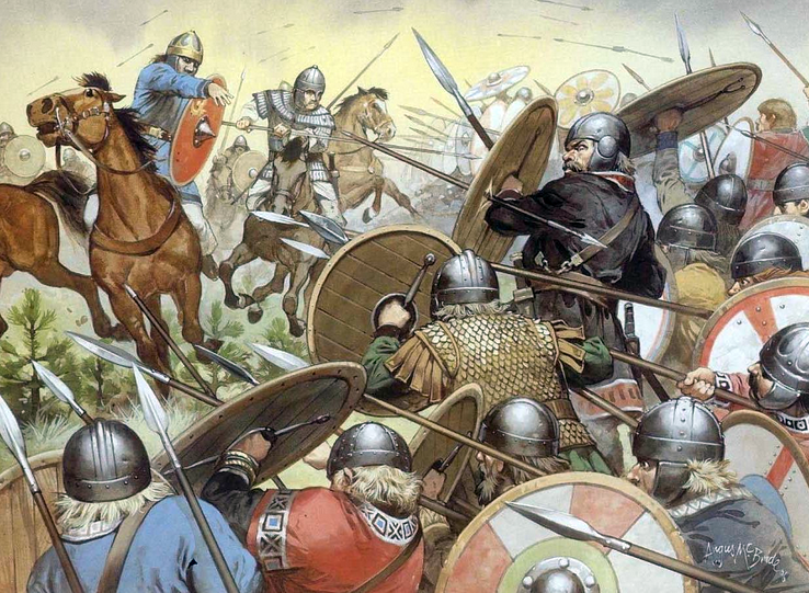 The confederate armies of Romans and Visigoths at last met their great adversary, face to face, on the ample battle-ground of the Chalons plains. Aetius commanded on the right of the allies; King Theodoric on the left; and Sangipan, king of the Alans, whose fidelity was suspected, was placed purposely in the centre and in the very front of the battle. Attila commanded his centre in person, at the head of his own countrymen, while the Ostrogoths, the Gepidae, and the other subject allies of the Huns, were drawn up on the wings. Some manoeuvring appears to have occurred before the engagement, in which Attila had the advantage, inasmuch as he succeeded in occupying a sloping hill, which commanded the left flank of the Huns. Attila saw the importance of the position taken by Aetius on the high ground, and commenced the battle by a furious attack on this part of the Roman line, in which he seems to have detached some of his best troops from his centre to aid his left. The Romans having the advantage of the ground, repulsed the Huns, and while the allies gained this advantage on their right, their left, under King Theodoric, assailed the Ostrogoths, who formed the right of Attila’s army. The gallant king was himself struck down by a javelin, as he rode onward at the head of his men, and his own cavalry charging over him trampled him to death in the confusion. But the Visigoths, infuriated, not dispirited, by their monarch’s fall, routed the enemies opposed to them, and then wheeled upon the flank of the Hunnish centre, which had been engaged in a sanguinary and indecisive contest with the Alans.