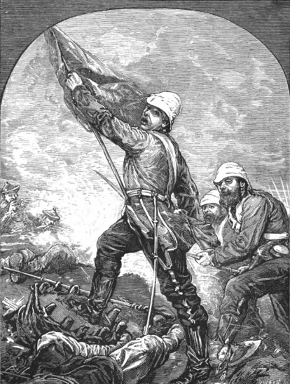 “Struggling on, with sword in one hand and colour-staff in the other . . . and shouting aloud the cry of ‘Victory,’ (he) was waving his flag aloft, when he was shot down”.