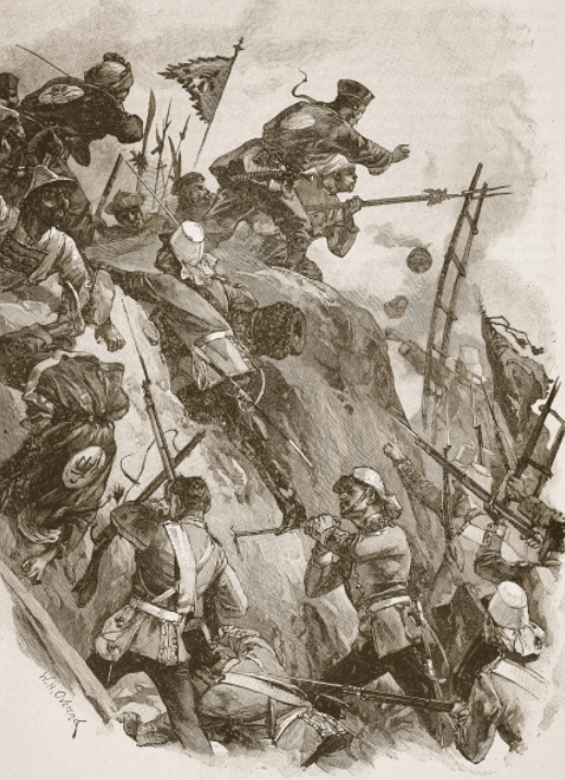 The scene at the foot of the fort was indescribable; the escalading ladders were being placed in position, and up them, in the midst of noise and smoke and confusion, each was trying for himself to climb the walls. Among those who succeeded was Captain Prynne, of the Royal Marines, who no sooner reached the top than, sitting astride the wall, he helped to pull up his men, using his revolver at intervals and with such effect that he succeeded in shooting down the commanding mandarin. Young Chaplin, forcing his desperate way up the breach made by the artillery fire, was wounded a second time, and again was urged to attend to himself and abandon the colour. But he was not to be persuaded; he had got so far in the race, and was still ahead of the French officer; if he paused the Frenchman would cut in and plant his flag first on the fort. So the plucky young Englishman, only staggering a little from the shock he had received, struggled on again towards the “cavalier,” or highest point of the work. Only one Englishman, Lane, a private of his own corps, was in a position to render him any assistance; and the Chinese, frantic in their last dying efforts, were flinging away the ladders, and fighting against the besiegers with the strength of despair.