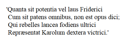 The Emperor was for a time successful: Tortona was taken, Milan razed to the ground, her name apparently lost: greater obstacles had been overcome, and a fuller authority was now exercised than in the days of the Ottos or the Henrys. The glories of the first Frankish conqueror were triumphantly recalled, and Frederick was compared by his admirers to the hero whose canonization he had procured, and whom he strove in all things to imitate. ‘He was esteemed,’ says one, ‘second only to Charles in piety and justice.’ ‘We ordain this,’ says a decree: ‘Ut ad Caroli imitationem ius ecclesiarum statum reipublicæ et legum integritatem per totum imperium nostrum servaremus.’ But the hold the name of Charles had on the minds of the people, and the way in which he had become, so to speak, an eponym of Empire, has better witnesses than grave documents. A rhyming poet sings:—