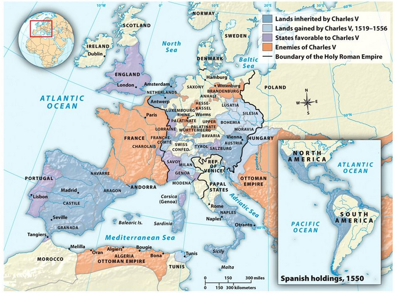 The breach came at the most unfortunate time possible. After an election, more memorable than any preceding, an election in which Francis the First of France and Henry the Eighth of England had been his competitors, a prince had just ascended the imperial throne who united dominions vaster than any Europe had seen since the days of his great namesake. Spain and Naples, Flanders, and other parts of the Burgundian lands, as well as large regions in Eastern Germany, obeyed Charles: he drew inexhaustible revenues from a new empire beyond the Atlantic. Such a power, directed by a mind more resolute and profound than that of Maximilian his grandfather, might have well been able, despite the stringency of his coronation engagements, and the watchfulness of the electors, to override their usurped privileges, and make himself practically as well as officially the head of the nation. Charles the Fifth, though from the coldness of his manner and his Flemish speech never a favourite among the Germans, was in point of fact far stronger than Maximilian or any other Emperor who had reigned for three centuries. In Italy he succeeded, after long struggles with the Pope and the French, in rendering himself supreme: England he knew how to lead, by flattering Henry and cajoling Wolsey: from no state but France had he serious opposition to fear. To this strength his imperial dignity was indeed a mere accident: its sources were the infantry of Spain, the looms of Flanders, the sierras of Peru. But the conquest once achieved, might could lose itself in right; and as an earlier Charles had veiled the terror of the Frankish sword under the mask of Roman election, so might his successor sway a hundred provinces with the sole name of Roman Emperor, and transmit to his race a dominion as wide and more enduring.