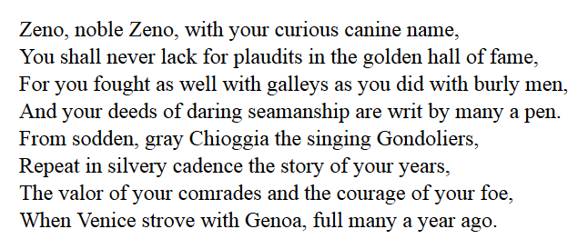 As a feat of generalship, Pisani’s blockade of the Genoese fleet is rivalled by Sampson’s blockade of Cervera’s squadron at Santiago in 1898, and the military operation by which Carlo Zeno tempted the garrison of Brondolo into the trap which he had set for them, and drove them, like a flock of sheep into Chioggia, by sunset, is surely a splendid feat of arms. All honor to this intrepid sea-dog of old Venice!