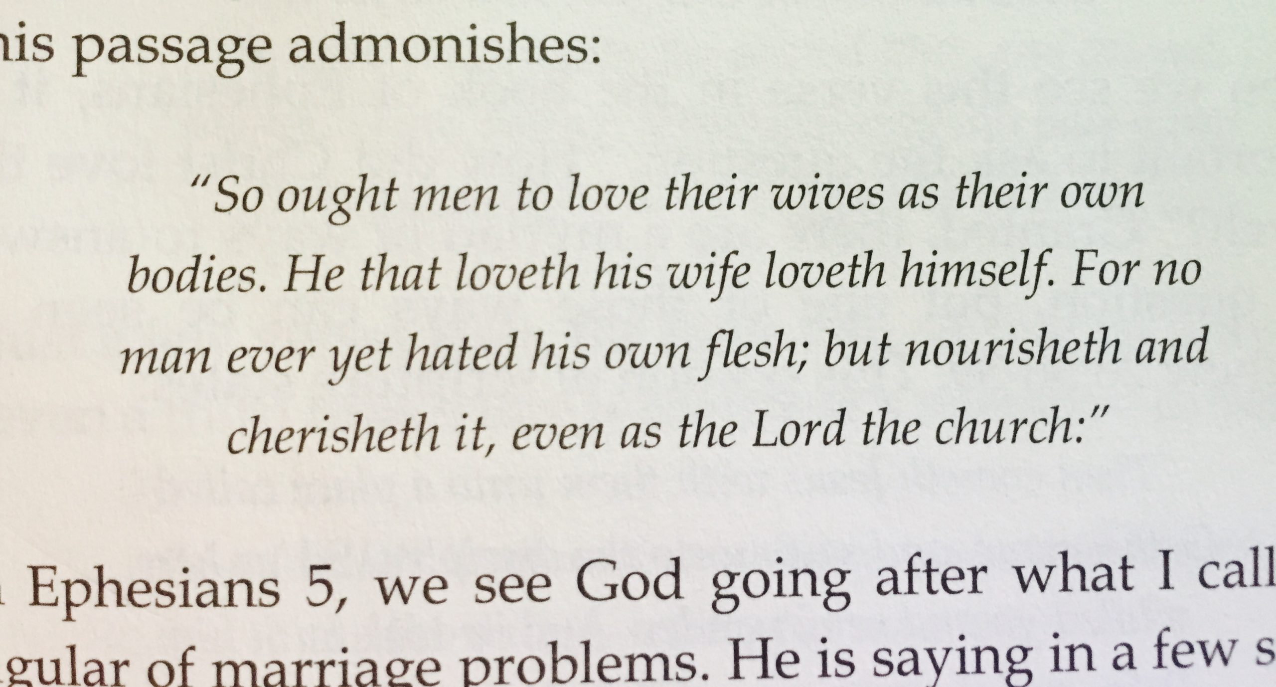 Husbands ought also to love their own wives as their own bodies. He who loves his own wife loves himself; for no one ever hated his own flesh, but nourishes and cherishes it, just as Christ also does the church…