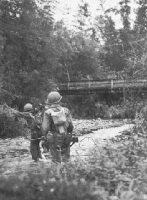 Stringing telephone wire from a forward observer’s nest to the regimental command post, two signal corps soldiers saw bullets chip the road under their feet. They dived into a ditch. The ditch was half filled with stagnant water. They heard more bullets bite into the rim of the ditch, and they heard the flat cracking of Japanese rifles in a bamboo thicket. One of the signal men was hit. The other, Pedro Echaves of San Diego, California, propped up his buddy’s head so that he would not drown in the muck. Then he dashed to the aid station for help. But the jail too, was under direct fire. The medics lay nailed to the ground.