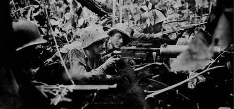Guns of the Field Artillery pounded the area. But in the narrow defile of the stream bed the Japanese were vulnerable only to direct hits. A radio message told the artillery to cease firing. Clifford ordered the battalion mortars into action. The mortars thumped, but their shells failed to blast the Japs from their holes. A platoon of riflemen then climbed the ridge on the left to gain commanding ground. They found a Japanese ambush on a bluff overlooking the stream. “Able” Company was sent up the incline to reinforce the vanguard platoon.