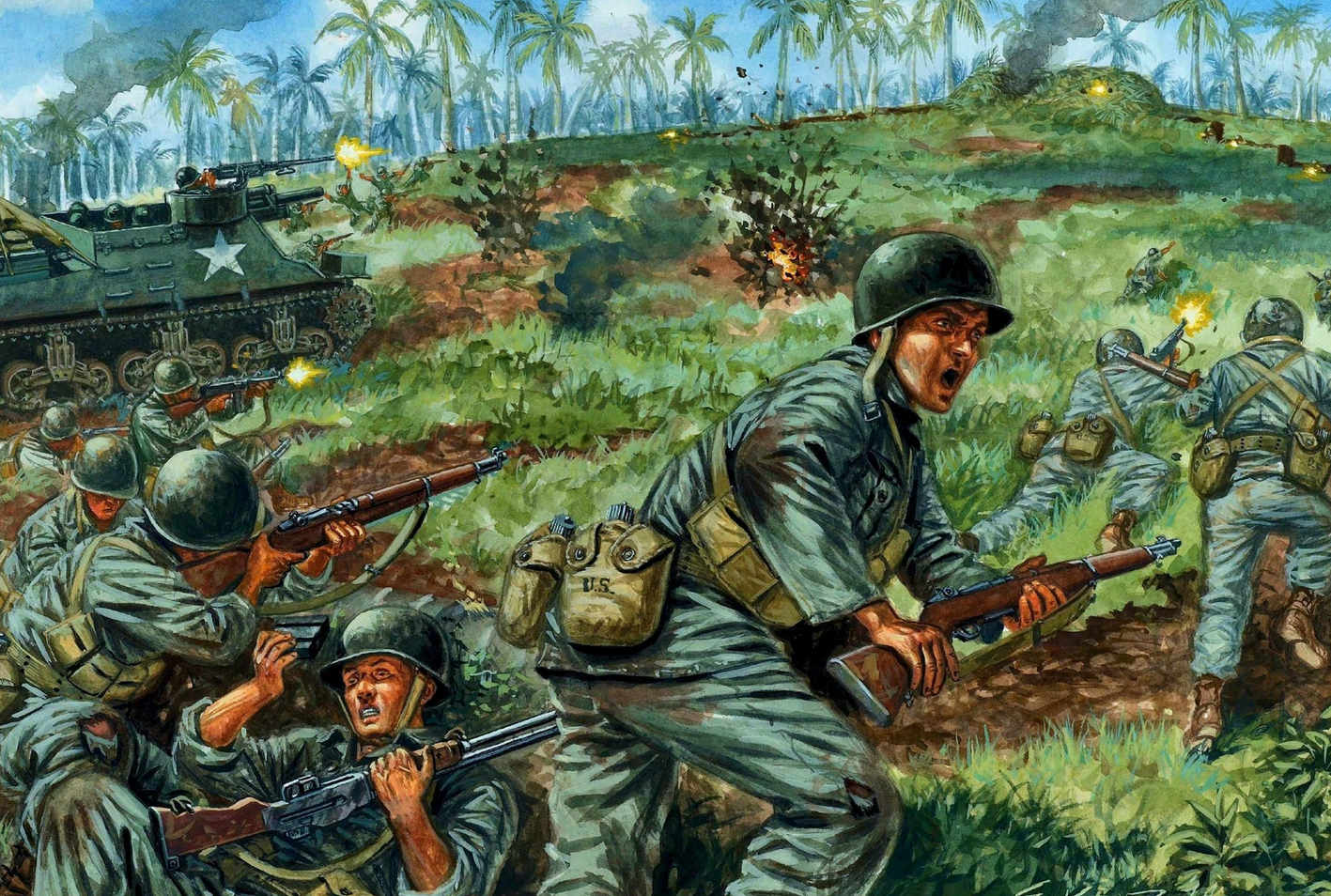 Infantrymen moved swiftly up the slope, scouts well in advance and Dallas Dick in the lead of “C” Company’s panting platoons. They climbed over cliffs and pushed through thickets that stung their faces and ripped their sweat-drenched fatigues. They traveled light. Their packs had been discarded on the beach. They carried their weapons, bandoleers of ammunition, their water and a few chocolate bars, no more. On the summit above, artillery still registered with destructive fury.