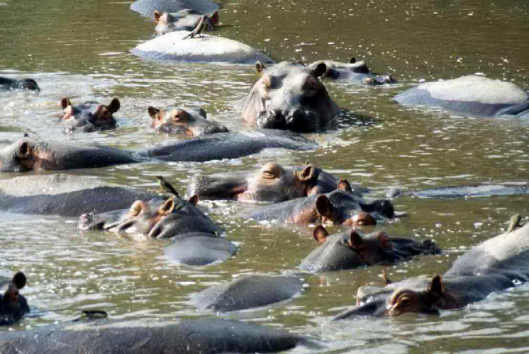 We were soon among the hippopotami. Every two or three hundred yards, and at every bend of the river, we came upon a herd of from five to twenty. To us in a steam launch they threatened no resistance or danger. But their inveterate hostility to canoes leads to repeated loss of life among the native fishermen, whose frail craft are crumpled like eggshells in the snap of enormous jaws. Indeed, all the way from here to Nimule they are declared to be the scourge and terror of the Nile. Fancy mistaking a hippopotamus—almost the largest surviving mammal in the world—for a water lily. Yet nothing is more easy. The whole river is dotted with floating lilies detached from any root and drifting along contentedly with the current. It is the habit of the hippo to loll in the water showing only his eyes and the tips of his ears, and perhaps now and again a glimpse of his nose, and thus concealed his silhouette is, at three hundred yards, almost indistinguishable from the floating vegetation. I thought they also looked like giant cats peeping. So soon, however, as they saw us coming round a corner and heard the throbbing of the propeller, they would raise their whole heads out of the water to have a look, and then immediately dive to the bottom in disgust. Our practice was then to shut off steam and drift silently down upon them. In this way one arrives in the middle of the herd, and when curiosity or want of air compels them to come up again there is a chance of a shot. One great fellow came up to breathe within five yards of the boat, and the look of astonishment, of alarm, of indignation, in his large, expressive eyes—as with one vast snort he plunged below—was comical to see. These creatures are not easy to kill. They bob up in the most unexpected quarters, and are down again in a second. One does not like to run the risk of merely wounding them, and the target presented is small and vanishing. I shot one who sunk with a harsh sort of scream and thud of striking bullet. We waited about a long time for him to float up to the surface, but in vain, for he must have been carried into or under a bed of reeds and could not be retrieved.
