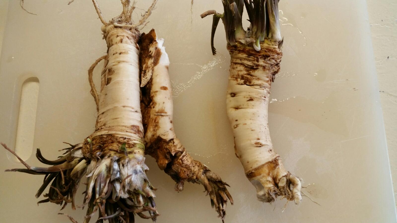 1. Dig the roots in late fall, after the tops die off but before the ground freezes – timing affects the flavor, and dormant roots will give you the most mace for the buck. Cut off the top 4″ of a few of the thin ones and just shove ’em back in the ground with the crown up. That’s next year’s crop, and now that’s out of the way.