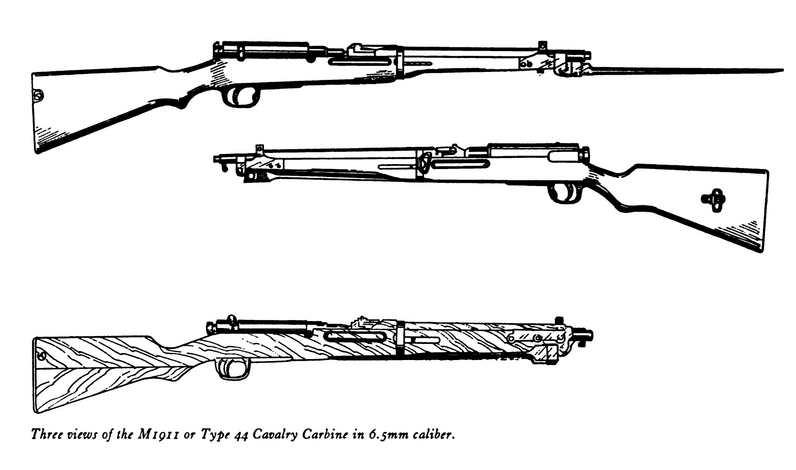 We had to wait until near the ending of the Guadalcanal operation before we were to come upon the most outstanding evidence of Japanese enthusiasm for cold steel. The astounding fact that bayonet fittings were used on light machine guns was discovered in the beginning, when we saw the first captured weapons on Lunga Beach, but it was not until the Cape Esperance show that we were to come across the Model 44 (1911) cavalry carbine, which had a bayonet permanently attached to the barrel, like a jack-knife blade, making the carbine muzzle-heavy and clumsy beyond belief.