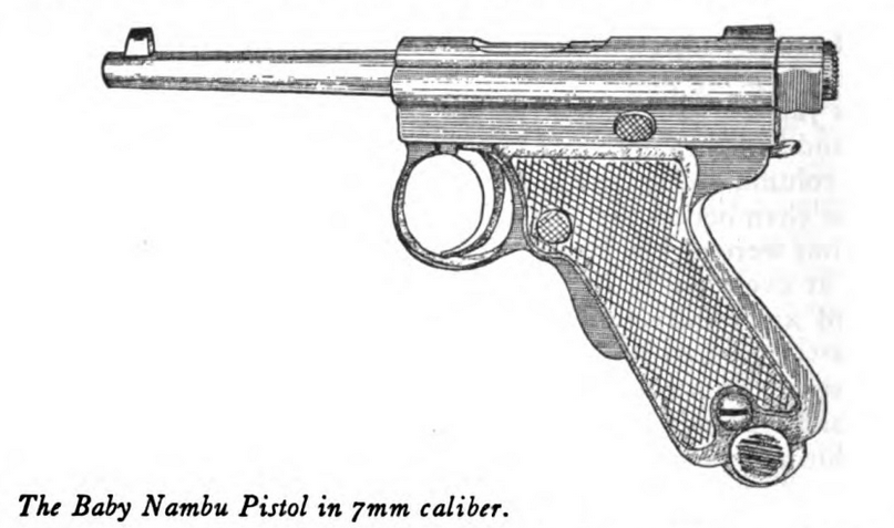 I liked this little weapon at first glance; it was hardly more than a handful for a big man yet it retained the lines of the Luger, lacking the boxlike appearance of the small American automatic pistols. Mechanically it was only a smaller version of the Nambu, having all of the Nambu’s faults — especially did it have the fault of a small trigger guard which did not allow enough room for a large finger to rest with any degree of safety.