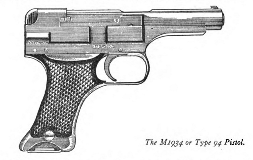 It is difficult to believe that the Baby Nambu and the better finished regular Nambus could have been turned out by the same people who later on manufactured so much junk. In 1934 the Japanese brought forth a handgun to disgrace their crudest blacksmith. They called this pistol the Type 94, and wisely issued it to people who did not have great use for a weapon, such as pilots and crew members of aircraft. Some few of them got into the hands of Infantrymen later on; I saw a few in Burma in 1944-5.