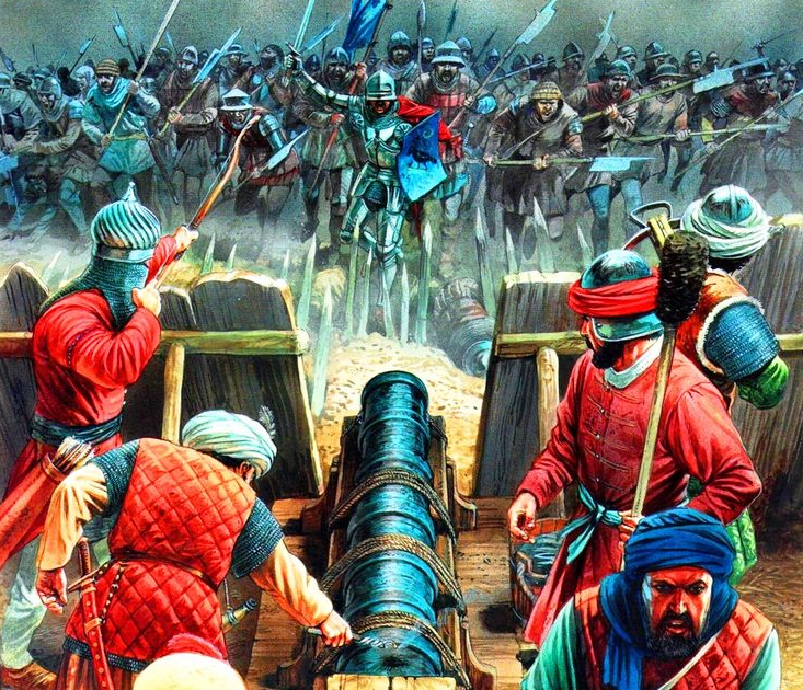 Many hundred large cannon began to break down the stone ramparts; many hundred boats forming a river flotilla covered the Danube, so as to cut off all communication between the fortress and Hungary. During this time Hunyady’s son Ladislaus and his brother-in-law Michael Szilagyi were in command in the fortress. Hunyady’s first daring plan was to force his way through the blockading flotilla, and enter Belgrad before the eyes of the whole Turkish army, taking with him his own soldiers and Capistran’s crusaders. The plan completely succeeded. With his own flotilla of boats he broke through that of the Turks and made his entrance into the fortress in triumph. After this the struggle was continued with equal resolution and ability on both sides; such advantage as the Christians derived from the protection afforded by the fortifications being fully compensated by the enormous superiority in numbers both of men and cannon on the part of the Turks.