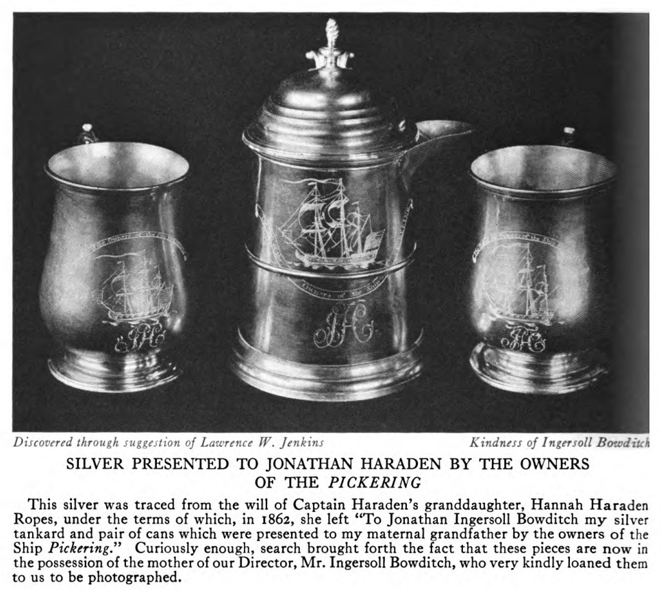 Toward the end of the Revolution, Haraden took command of the Letter of Marque ship Julius Caesar, carrying 40 men and 14 guns, which he handled with such bravery and skill that her owners pre sented him with a massive plate. His descendants treasure a gift of silver received from the owners of the General Pickering, shown in an illustration on another page.