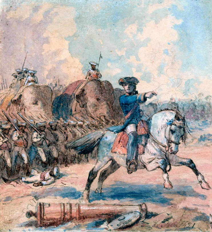 The nabob did not keep them waiting. At daybreak, he moved his army towards the place where the English lay; and Clive, looking from the mango grove, could see with his own eyes whom he had to encounter. Fifteen thousand horsemen, who appeared no contemptible antagonists; forty thousand footmen, fifty pieces of large ordnance drawn by white oxen, and pushed onwards by elephants; and some smaller pieces under the direction of French auxiliaries — such was the army which moved for ward to try conclusions with “Clive, the daring in war.”