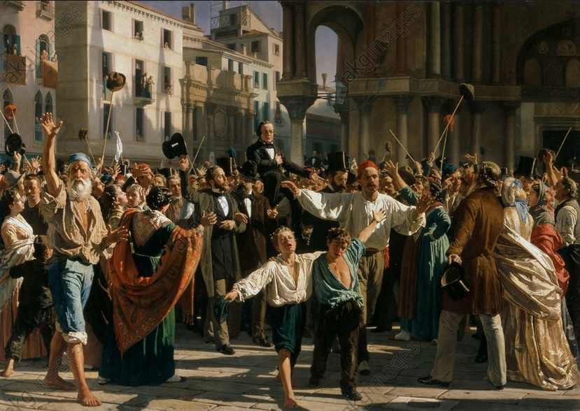 The first effect of the news on Venice was absolute stupefaction, then a wild rush to the Square of St. Mark’s. A tremendous crowd called, as usual in its troubles, for its “father, Manin!” Said a foreigner who was a witness of the scene, “The faith of Venice in this man was inconceivable, complete, and absolute. He had never deceived, never abused it. The people seemed to attribute to him omnipotence and omniscience, and believed him capable of guarding Venice from every peril, and of rescuing her from every calamity.”