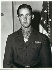 For conspicuous gallantry and intrepidity at the risk of his life above and beyond the call of duty as a squad leader serving with the 1st Battalion, 4th Marines, 6th Marine Division, in action against enemy Japanese forces, during the final assault against Mount Yaetake on Okinawa, Ryukyu Islands, 16 April 1945. Rallying his men forward with indomitable determination, Cpl. Bush boldly defied the slashing fury of concentrated Japanese artillery fire pouring down from the gun-studded mountain fortress to lead his squad up the face of the rocky precipice, sweep over the ridge, and drive the defending troops from their deeply entrenched position. With his unit, the first to break through to the inner defense of Mount Yaetake, he fought relentlessly in the forefront of the action until seriously wounded and evacuated with others under protecting rocks. Although prostrate under medical treatment when a Japanese hand grenade landed in the midst of the group, Cpl. Bush, alert and courageous in extremity as in battle, unhesitatingly pulled the deadly missile to himself and absorbed the shattering violence of the exploding charge in his body, thereby saving his fellow marines from severe injury or death despite the certain peril to his own life. By his valiant leadership and aggressive tactics in the face of savage opposition, Cpl. Bush contributed materially to the success of the sustained drive toward the conquest of this fiercely defended outpost of the Japanese Empire. His constant concern for the welfare of his men, his resolute spirit of self-sacrifice, and his unwavering devotion to duty throughout the bitter conflict enhance and sustain the highest traditions of the U.S. Naval Service.