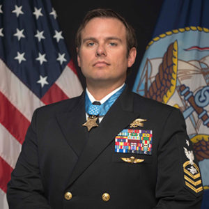 For conspicuous gallantry and intrepidity at the risk of his life above and beyond the call of duty as a Hostage Rescue Force Team Member in Afghanistan in support of Operation ENDURING FREEDOM from 8 to 9 December 2012. As the rescue force approached the target building, an enemy sentry detected them and darted inside to alert his fellow captors. The sentry quickly reemerged, and the lead assaulter attempted to neutralize him. Chief Byers with his team sprinted to the door of the target building. As the primary breacher, Chief Byers stood in the doorway fully exposed to enemy fire while ripping down six layers of heavy blankets fastened to the inside ceiling and walls to clear a path for the rescue force. The first assaulter pushed his way through the blankets, and was mortally wounded by enemy small arms fire from within. Chief Byers, completely aware of the imminent threat, fearlessly rushed into the room and engaged an enemy guard aiming an AK- 47 at him. He then tackled another adult male who had darted towards the corner of the room. During the ensuing hand-to-hand struggle, Chief Byers confirmed the man was not the hostage and engaged him. As other rescue team members called out to the hostage, Chief Byers heard a voice respond in English and raced toward it. He jumped atop the American hostage and shielded him from the high volume of fire within the small room. While covering the hostage with his body, Chief Byers immobilized another guard with his bare hands, and restrained the guard until a teammate could eliminate him. His bold and decisive actions under fire saved the lives of the hostage and several of his teammates. By his undaunted courage, intrepid fighting spirit, and unwavering devotion to duty in the face of near certain death, Chief Petty Officer Byers reflected great credit upon himself and upheld the highest traditions of the United States Naval Service.