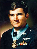For conspicuous gallantry and intrepidity in action at the risk of his life above and beyond the call of duty. Sgt. Levitow (then A1c.), U.S. Air Force, distinguished himself by exceptional heroism while assigned as a loadmaster aboard an AC-47 aircraft flying a night mission in support of Long Binh Army Post. Sgt. Levitow’s aircraft was struck by a hostile mortar round. The resulting explosion ripped a hole two feet in diameter through the wing and fragments made over 3,500 holes in the fuselage. All occupants of the cargo compartment were wounded and helplessly slammed against the floor and fuselage. The explosion tore an activated flare from the grasp of a crewmember who had been launching flares to provide illumination for Army ground troops engaged in combat. Sgt. Levitow, though stunned by the concussion of the blast and suffering from over 40 fragment wounds in the back and legs, staggered to his feet and turned to assist the man nearest to him who had been knocked down and was bleeding heavily. As he was moving his wounded comrade forward and away from the opened cargo compartment door, he saw the smoking flare ahead of him in the aisle. Realizing the danger involved and completely disregarding his own wounds, Sgt. Levitow started toward the burning flare. The aircraft was partially out of control and the flare was rolling wildly from side to side. Sgt. Levitow struggled forward despite the loss of blood from his many wounds and the partial loss of feeling in his right leg. Unable to grasp the rolling flare with his hands, he threw himself bodily upon the burning flare. Hugging the deadly device to his body, he dragged himself back to the rear of the aircraft and hurled the flare through the open cargo door. At that instant the flare separated and ignited in the air, but clear of the aircraft. Sgt. Levitow, by his selfless and heroic actions, saved the aircraft and its entire crew from certain death and destruction. Sgt. Levitow’s gallantry, his profound concern for his fellow men, at the risk of his life above and beyond the call of duty, are in keeping with the highest traditions of the U.S. Air Force and reflect great credit upon himself and the Armed Forces of his country.