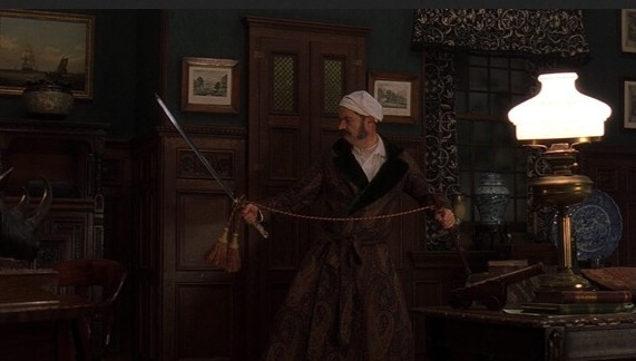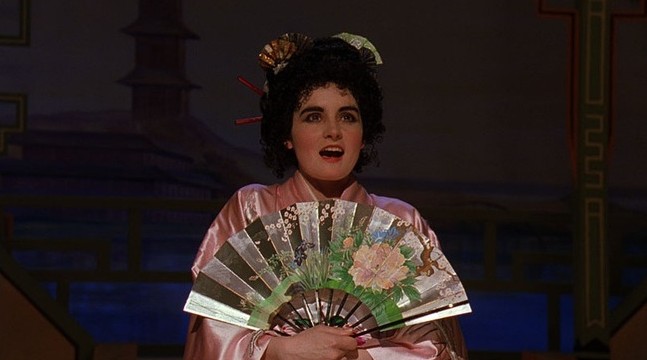 Gilbert attends a Japanese cultural exposition in Knightsbridge, where he observes a Kabuki play with intense fascination and purchases a souvenir katana to display in his study. When the sword falls from its mounting, he draws the blade and brandishes it playfully before sheathing and laying it on a pile of books. Regarding it, his face lights up with sudden inspiration as we hear the opening heraldic notes of “Behold the Lord High Executioner”. The film transports us instantly to a stage performance of this song from Act I of The Mikado—and into that realm of keen satire fused with exuberant, profoundly beautiful melody, where the Japanese crown prince Nanki-Poo, disguised as a wandering minstrel, seeks the forbidden hand of his lady love, Yum-Yum. This is one of many deft segues whereby Leigh solves a key structural problem of the story (how to balance depictions of the opera’s making with selections of the finished product), and impresses upon us the magnitude of the artistic advance beyond The Sorcerer. Preposterous as its subject—the elevation of a petty convict to the rank of dread magistrate—may be, “Behold” in its playful genuflections is a far more engaging and powerful work than all the hideous conjuring of “Sprites of Earth and Air.”