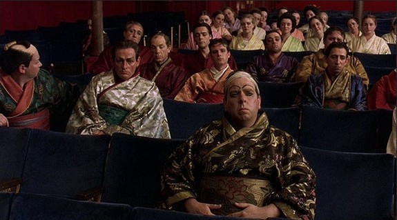 Indeed it is through the struggles of the performers themselves, both with the material and the difficulties of their personal lives, that Leigh reveals the true heart of theater. The dressing room gossip and backstage banter, arguments with the director and fussing over unfamiliar costumes, while seemingly petty, here express something essential about great works of the stage: they are made by flawed and even broken people, surmounting inner limitations to grapple with the conceptual and technical demands of an art form. Every actor and singer in the film, from the celebrated principals to the backmost row of the chorus, is a dedicated professional. Gilbert’s acknowledgement of this goes beyond mere courtesy; he relents when the assembled cast petitions him to restore a song (“A More Humane Mikado”) he’d cut from Act II.
