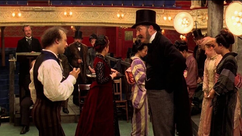Sullivan, drawn by a tale with broad human scope, returns to the partnership, and the remainder of the film devotes itself to the painstaking craft and labor of bringing the opera to life. We see G&S’s attentiveness to every detail in their respective spheres. Costumes are tailored to meet a standard of authenticity. Japanese ladies are brought in to teach British actresses how to walk and hold fans properly. Rehearsal, the grueling process of repetition and refinement, proceeds on stage and in the orchestra pit. D’Oyly Carte adroitly manages a stable of vain, recalcitrant, or addicted performers with a judicious combination of incentives and politely worded threats.