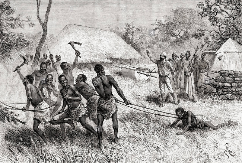 Besides being able to dig up the carelessly buried bodies of natives who have died a natural death, the customs of some of the warlike tribes used to provide hyænas with many a dainty meal. In 1873 my old friend the late Mr. Frank Mandy—afterwards for so many years the manager of De Beers Compound at Kimberley—saw some natives dragging, with thongs attached to the wrists, what he thought was a dead body across the stony ground outside the native town of Bulawayo. On going nearer he was horrified to find that the body was that of an old woman, and that she was alive. On remonstrating with the men who were dragging the poor creature along, and taxing them with their inhumanity, they seemed quite hurt, and said, “Why, what use is she? She’s an old slave, and altogether past work, and we are going to give her to the hyænas.” They accordingly dragged her down to the valley below Bulawayo and tied her to a tree. My friend had followed and watched them, and that evening, as soon as it was dusk, he and a trader named Grant—who was murdered in Mashunaland by the natives during the rising of 1896—went down to her with a stretcher, and cutting the thongs that bound her to the tree, carried her up to Mandy’s hut, where, however, she died during the night.