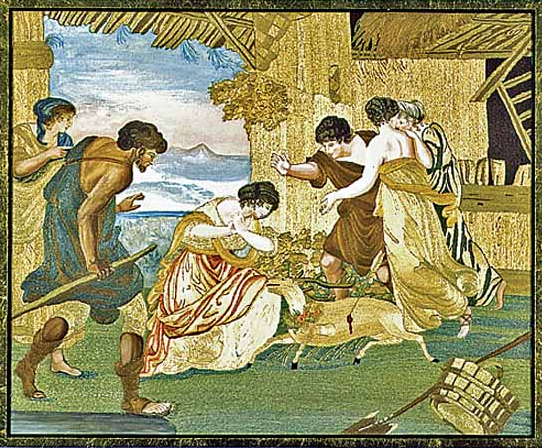 One day when Ascanius, Æneas’s son, who had now grown to be a young man, and who seems to have been characterized by a full share of the ardent and impulsive energy belonging to his years, was returning from the chase, he happened to pass by the place where the herdsman lived. Ascanius was followed by his dogs, and he had his bow and arrows in his hand. As he was thus passing along a copse of wood, near a brook, the dogs came suddenly upon Sylvia’s stag. The confiding animal, unconscious of any danger, had strayed away from the herdsman’s grounds to this grove, and had gone down to the brook to drink. The dogs immediately sprang upon him, in full cry. Ascanius followed, drawing at the same time an arrow from his quiver and fitting it to the bow. As soon as he came in sight of the stag, he let fly his arrow. The arrow pierced the poor fugitive in the side, and inflicted a dreadful wound. It did not, however, bring him down. The stag bounded on down the valley toward his home, as if to seek protection from Sylvia. He came rushing into the house, marking his way with blood, ran to the covert which Sylvia had provided for his resting place at night, and crouching down there he filled the whole dwelling with piteous bleatings and cries.