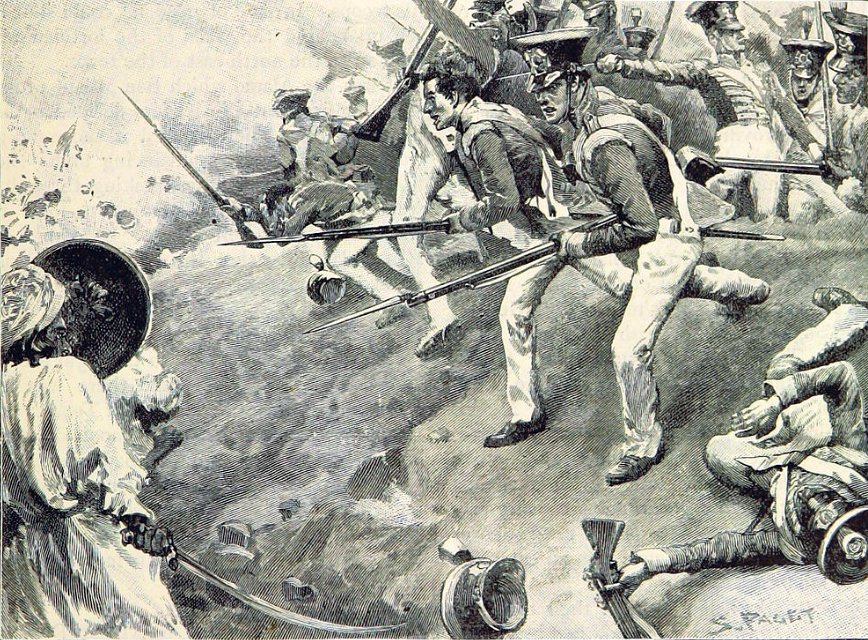 Miāni (February 17, 1843) was the most glorious day in his life. With 2,400 troops, of whom barely 500 were Europeans, he attacked an army variously estimated between 20,000 and 40,000. Drawn up in a position, which they had themselves chosen, on the raised bank of a dry river bed, the Baluchī seemed to have every advantage on their side. But the British troops, advancing in echelon from the right, led by the 22nd Regiment, and developing an effective musketry fire, fought their way up to the outer slope of the steep bank and held it for three hours. Here the 22nd, with the two regiments of Bombay sepoys on their left, trusting chiefly to the bayonet, but firing occasional volleys, resisted the onslaught of Baluchī swordsmen in overwhelming numbers. During nearly all this time the two lines were less than twenty yards apart, and Napier was conspicuous on horseback riding coolly along the front of the British line. The matchlocks, with which many of the Baluchī were armed, seem to have been ineffective; their national weapon was the sword. The tribesmen were grand fighters but badly led. They attacked in detachments with no concerted action. For all that, the British line frequently staggered under the weight of their courageous rushes, and irregular firing went on across the narrow gap. Napier says, ‘I expected death as much from our own men as from the enemy, and I was much singed by our fire—my whiskers twice or thrice so, and my face peppered by fellows who, in their fear, fired over all heads but mine, and nearly scattered my brains’. Not even Scarlett at Balaclava had a more miraculous escape. This exposure of his own person to risk was not due to mere recklessness. In his days at the Royal Military College he had carefully considered the occasions when a commander must expose himself to get the best out of his men; and from Coruña to Dabo he acted consistently on his principles. Early in the battle he had cleverly disposed his troops so as to neutralize in some measure the vast numerical superiority of the enemy; his few guns were well placed and well served. At a critical moment he ordered a charge of cavalry which broke the right of their position and threatened their camp; but the issue had to be decided by hard fighting, and all depended on the morale which was to carry the troops through such a punishing day.