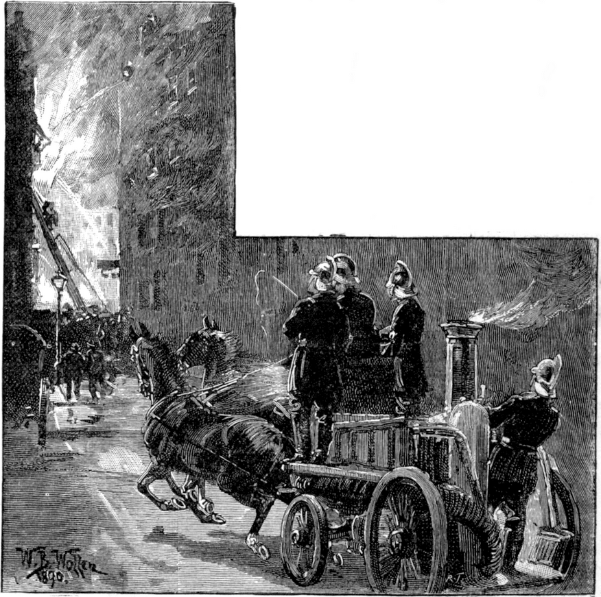 The nearest brigade station was speedily aroused, the news telegraphed to others, and ere long several fire-engines had hurried to the spot. Quickly they were placed at different points about the building, and streams of water were thrown on the fire. But in spite of all efforts, it gained rapidly on the large structure.