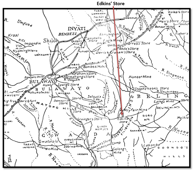 Not far from the once large military kraal of Gorshlwayo, near the southern border of Essexvale, was a trading station known as Edkins’ store. In the neighbourhood were several mining camps and the residence of a native commissioner, and it is here probably that the first murders of Europeans were committed during the present native rising.
