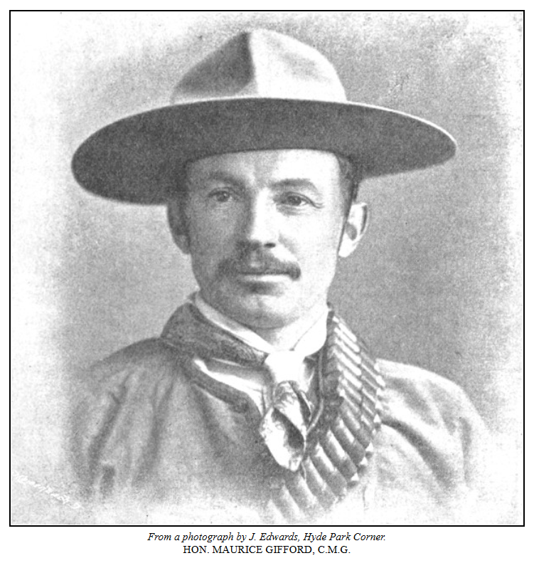 At this time no organised force existed in the country, with the exception of the few men of the Matabele Mounted Police under Captain Southey; and there were only some 370 rifles in the Government stores. However, no difficulty was experienced in getting men together who were ready to proceed at once to the relief of their countrymen and countrywomen; and, as I have already narrated, three small corps under experienced leaders were despatched to various outlying districts within a few hours of the time when the first alarm was given. The Hon. Maurice Gifford, as energetic as he is brave, got off that same evening with about forty men, including Captain Southey and twelve of his Mounted Police; his object being the relief of the men who had laagered up at Cumming’s store. The first sign of the rising seen by this party was near Woodford’s store, about fourteen miles beyond Thaba Induna, or twenty-six from Bulawayo. Here an abandoned waggon was found standing in the road, the sixteen donkeys that had been harnessed to it lying all of a heap dead. They had for the most part been stabbed to death with assegais, but some had been shot. Nothing on the waggon had been touched, though it was loaded with flour, whisky, etc. No trace of those who had been in charge of the waggon could be discovered, but it has been subsequently ascertained that they were murdered in the bush some little distance away. They were colonial boys taking down a load of stores to the Insiza district. Soon after this derelict waggon had been passed, three colonial boys were met making their way to Bulawayo, one armed with a rifle and another with a revolver. They reported to Mr. Gifford that the rising was general in the Insiza district, and said that a Dr. and Mrs. Langford had been killed on the previous day—Wednesday, 25th March—near Rixon’s farm; but that Mr. Rixon, the Blicks, and others in the district had escaped to the laager at Cumming’s store. They also told Mr. Gifford that they had seen several troops of cattle being driven by armed Matabele towards the Malungwani and Matopo Hills. On meeting Mr. Gifford these “boys” turned back and accompanied him to the Insiza, and did good service in the subsequent fight, in which one of them was wounded.