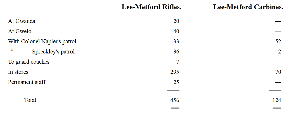 In the way of artillery there was in Bulawayo when the insurrection broke out one 303 Maxim gun in good order, and a second so much out of repair as to be useless; two 2.5 screw guns in good order, but with only seventeen rounds of ammunition for the two; one Hotchkiss gun and limber, one Gatling, one Gardner, one Nordenfeldt—all in good order—and one seven-pounder, useless except at Bulawayo owing to carriage having been destroyed by white ants. In addition to this ordnance there arrived in Bulawayo from Macloutsie, on the very day on which Mr. Maddocks was murdered, two old Maxims and two seven-pounders. These, however, were unserviceable at the time, one of the seven-pounders being without a carriage and the two Maxims being also out of repair. The armourer here has now, however, I believe, put them all in working order.