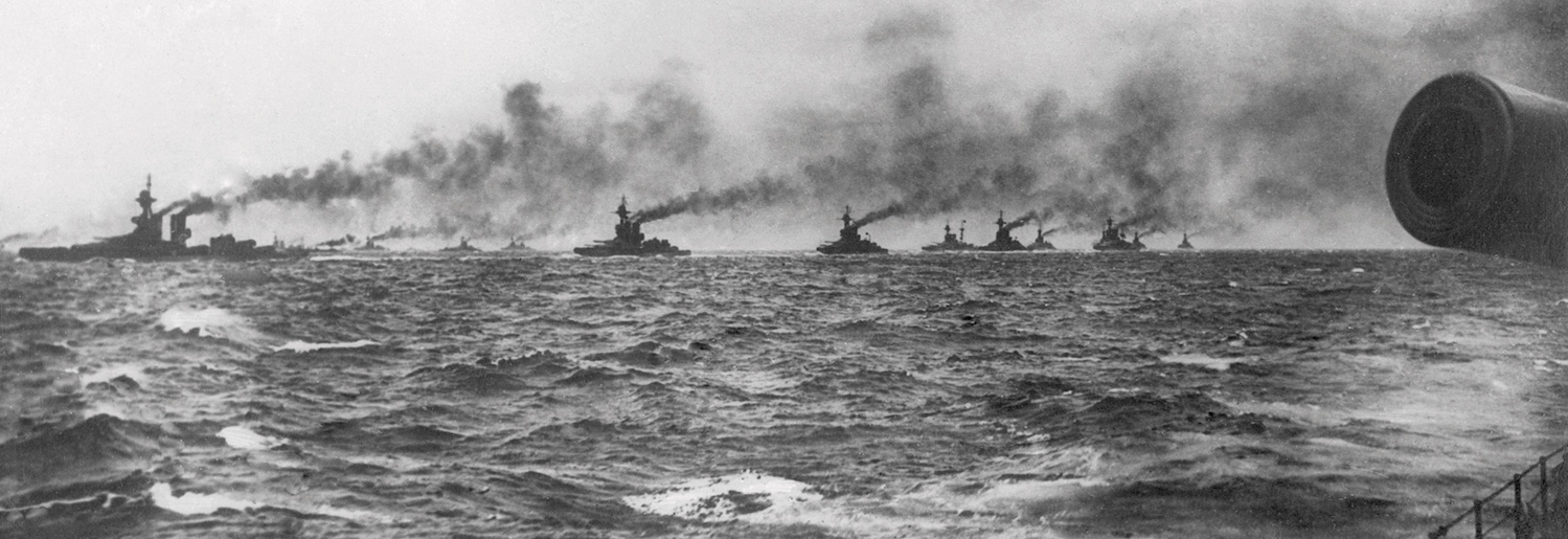 The Grand Fleet was now rapidly approaching, and Admiral Jellicoe had to prepare for the extremely difficult manoeuvre of joining battle with an enemy of whose position he was not fully informed. Gun-flashes were reported at 6.5 on the starboard bow, but the only ships visible were the Lion and other battle-cruisers steering east in thick mist. The admiral lost no time; at 6.8 he ordered two torpedo flotillas to his port front and one to starboard; then, after receiving a further report from Admiral Beatty, at 6.16 he ordered his six divisions of battleships to deploy eastwards, forming on the port wing column. He thus threatened to cut off the enemy from his base, and in order to close him the more quickly the deployment was made by divisions instead of in succession. The movement was entirely successful. At the same time the battle-cruisers were getting clear to the south and east, and Admiral Evan-Thomas’s four ships were forming astern of the fleet. They did this under fire, but without serious interference; the Warspite, whose helm jammed, was for a few moments carried over towards the enemy, but the German gunnery was no longer steady enough to hit her.
