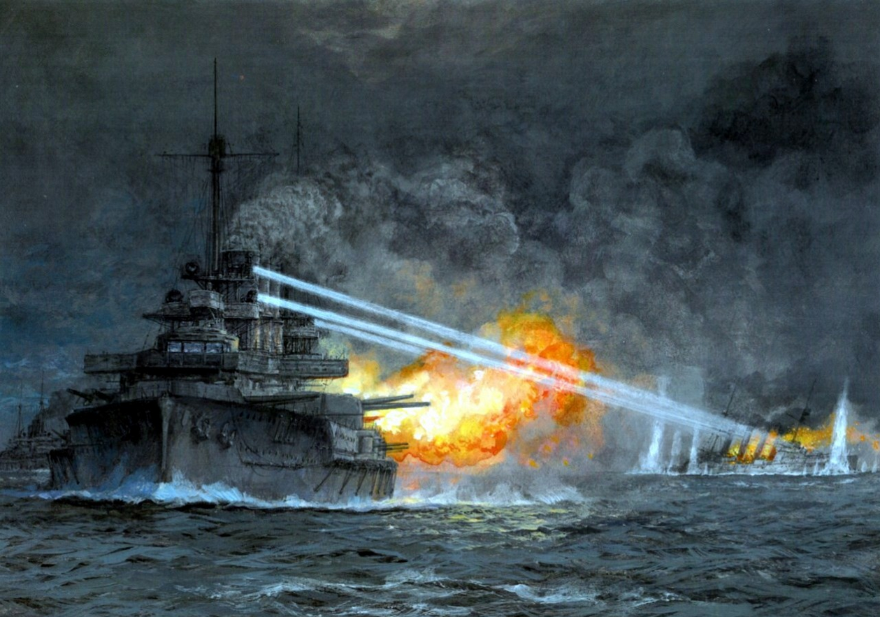 But by this time the action between the main fleets had been virtually lost and won. The German battleships at the head of Admiral Scheer’s line had suffered severely under the fire of the British rear divisions and were turning away south, while their battle-cruisers were in even worse plight. Two minutes after the Invincible sank, the Lutzow was no longer able to keep station, and Admiral Hipper was compelled to transfer his flag. But his difficulty was to find a sound ship; his next astern, the Derfflinger, had lost her wireless and was gaping with a hole 20 feet square in her bows; the Seydlitz had also lost her wireless, and had shipped several thousand tons of water. After being some time in a destroyer, the admiral went aboard the Moltke, and sent the Derfflinger to lead the line, with only the Von der Tann to follow.
