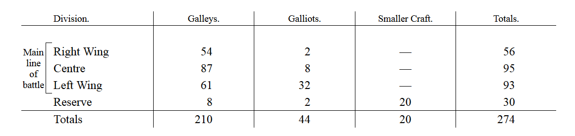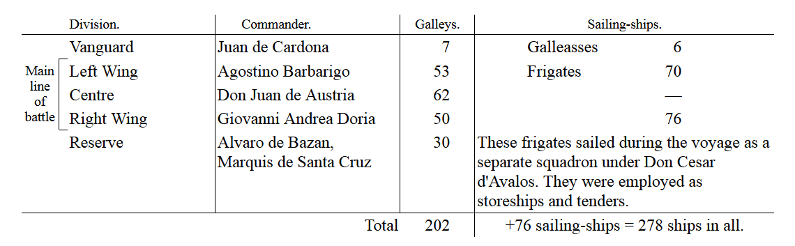 The organization of the Christian armada may be thus summed up in tabular form:—