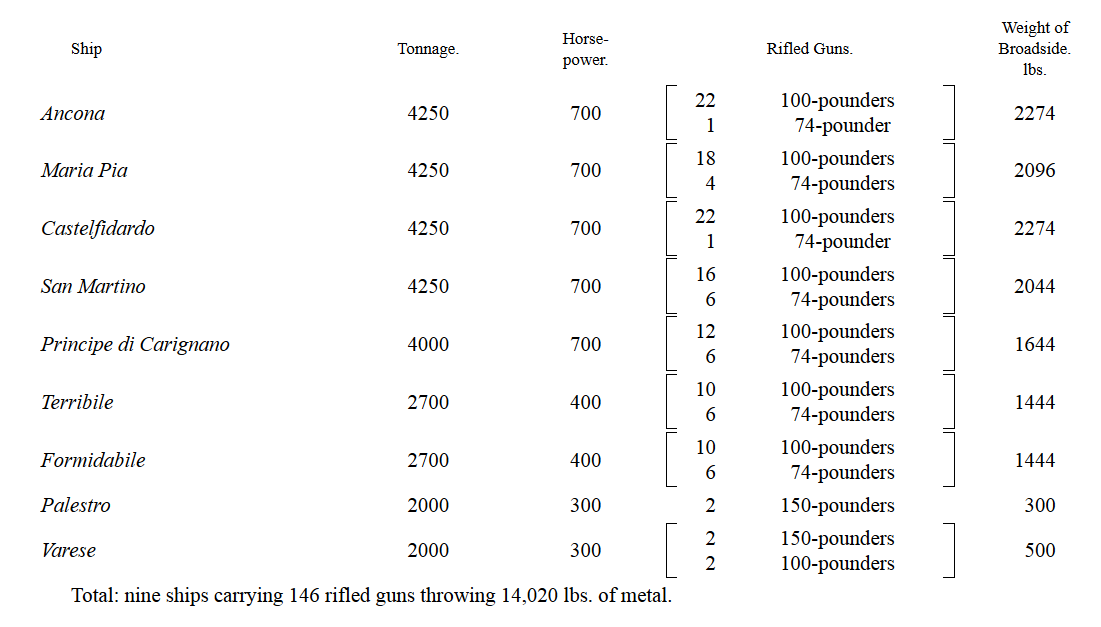What could the seven Austrian ironclads with their 74 little guns throwing 1776 pounds of metal do against these nine ships with double the number of guns and nearly ten times the weight of metal in their broadsides? But add in the three capital ships before noted on the Italian side, and we have:—