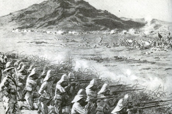 The troops were ranged two deep in front with a partial second double line or supports placed twenty yards or so behind them. These assisted in the fight to pass ammunition to the firing line and carry back the dead and wounded. Somewhat removed from the zereba and trenches, and nearer the Nile were the hospitals, the transport, the stores, nearly 3000 camels, and about 500 mules. The Egyptian cavalry and camelry were picketed at the north of the camp, and the 21st Lancers at the south end, both being within the lines. All along the river’s bank beside the camp were moored the gunboats, steamers and barges, with a fleet of a hundred or more native sailing boats, at once a means of defence and a supply column. The gunboat “Melik” was moored a few hundred yards south of where the Rifles were posted. Occasionally the flotilla flashed their search-lights upon Jebel Surgham, and swept the scrub and desert in front of the troops. The enemy’s scouts, however, were never disclosed in the radii of the electric beams. In fact, the first notice we had that the dervishes were about to inspect our environment was the impetuous incoming of our friendlies from Jebel Surgham and the cracking of snipers’ guns in the bush mingled with the buzzing of bullets overhead. A battalion rose quietly from the ground, for the troops slept clear of the hedge, and went forward a few paces to man the zereba. On learning what was actually taking place they returned to their blankets and to sleep.
