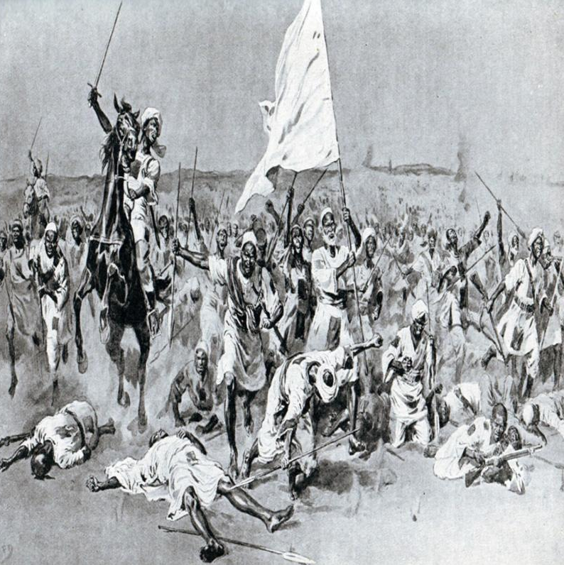 Out of immediate danger and re-formed, the Khalifa and Yacoub determined upon a second attack. With a rush like a mountain torrent three columns spouted from shallow ravines, and at a break-neck run came forward. Part of Wad Melik’s men uprose from the west sides of Surgham, the Khalifa and Yacoub came upon us from the south-west, and a smaller body from the west. In half delirium and full frenzy on rushed the dervishes. Our guns, knowing the range to a nicety—for they were able to see landmarks put down the day before—hurled at them avalanches of shell. The vivid air blazed and shook, and the hail of Lee-Metfords cut, like mighty scythes, lanes in the columns massed ten-deep. Greater resolution and bravery no men ever possessed. In face of destruction and death they continued their wild race. But they were thinning or being thinned as they drew nearer. When about 1100 yards away a body of horsemen, two hundred or so, the Khalifa’s own tribesmen, Taaisha Baggara, chiefs and Emirs, setting spurs to their horses charged direct for the zereba. Cannon and Maxims smashed them, infantry bullets beat against and pierced through them. At every stride their numbers diminished, horses and riders being literally blown over or cut and thrown down. Undaunted a remnant held on to within two or three hundred yards of Colonel Maxwell’s line, where the last of the gallant foemen tumbled and bit the dust. Partly encouraged by the self-sacrificing devotion of the horsemen, the footmen followed. The black flag was carried to within 900 yards of Colonel Maxwell’s left. Learning from their earlier failure, the Khalifa’s men directed their attack upon the Egyptian troops. But the British division’s cross-fire smote them, and the guns and Maxims knocked all cohesion out of their ranks. Still defiantly they set their standards and died around them. Then I noted there were again signs of wavering amongst the main body, who were hanging back. The big black flag was stuck in a heap of stones, and the more devoted sought to rally there. Abdullah himself and his chiefs endeavoured to collect the broken columns. It was attempted in the face of a bombardment that would have shaken a city, and a fusilade that ought to have mown down every blade of halfa-grass near. But Maxwell’s men seemed not quite to get the range. The flag and flagstaff were riddled with bullet holes, and the dead were being piled around. Still, dervish after dervish sprang to uphold the black banner of Mahdism. A herculean black grasped the staff in one hand, and leaned negligently against it for what appeared to be the space of five or ten minutes,—probably less than one minute,—ere the soldiers managed to give him his final quietus. Then it was that the remnant of the army of the Khalifa began to melt away. It was more than human nature could bear. The dense columns had shrunk to companies, the companies to driblets, which finally fled westward to the hills, leaving the field white with jibbeh-clad corpses like a landscape dotted with snowdrifts.